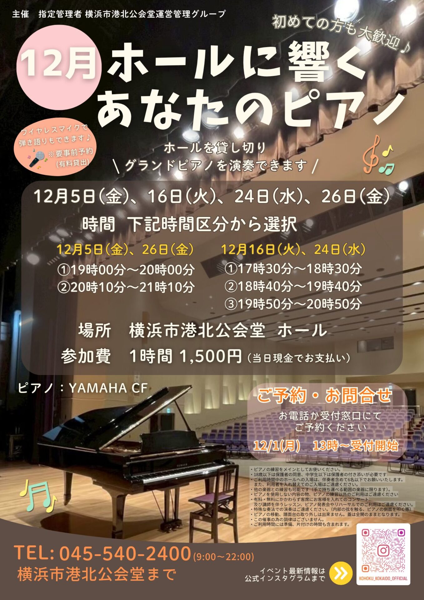 《12/1(月)13時~受付開始》12月開催!リコーダー教室&ホールに響くあなたのピアノ