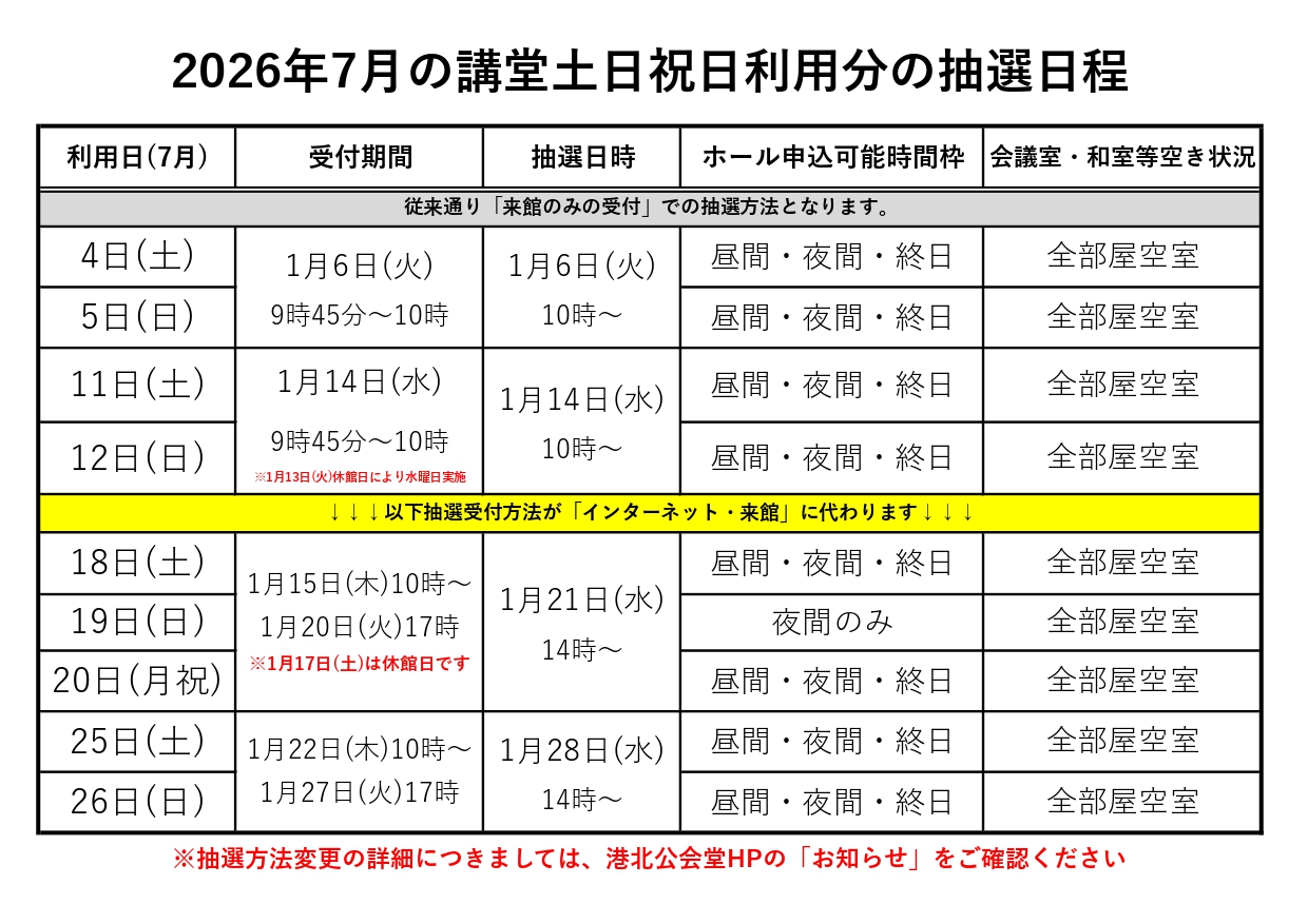 2026年7月の講堂の土日祝日利用分の抽選を、下記日程にて開催いたします。