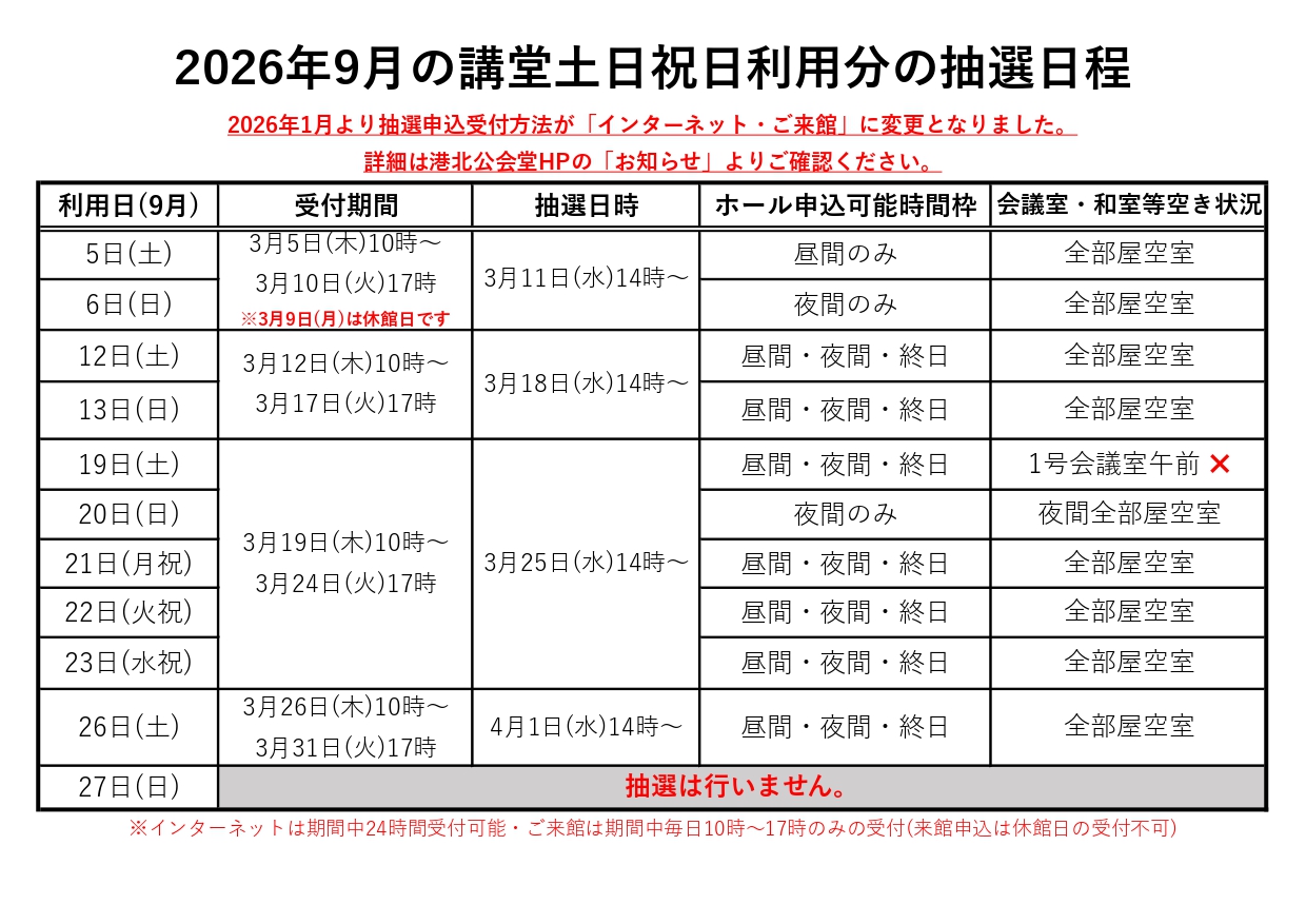 2026年9月の講堂の土日祝日利用分の抽選を、下記日程にて開催いたします。