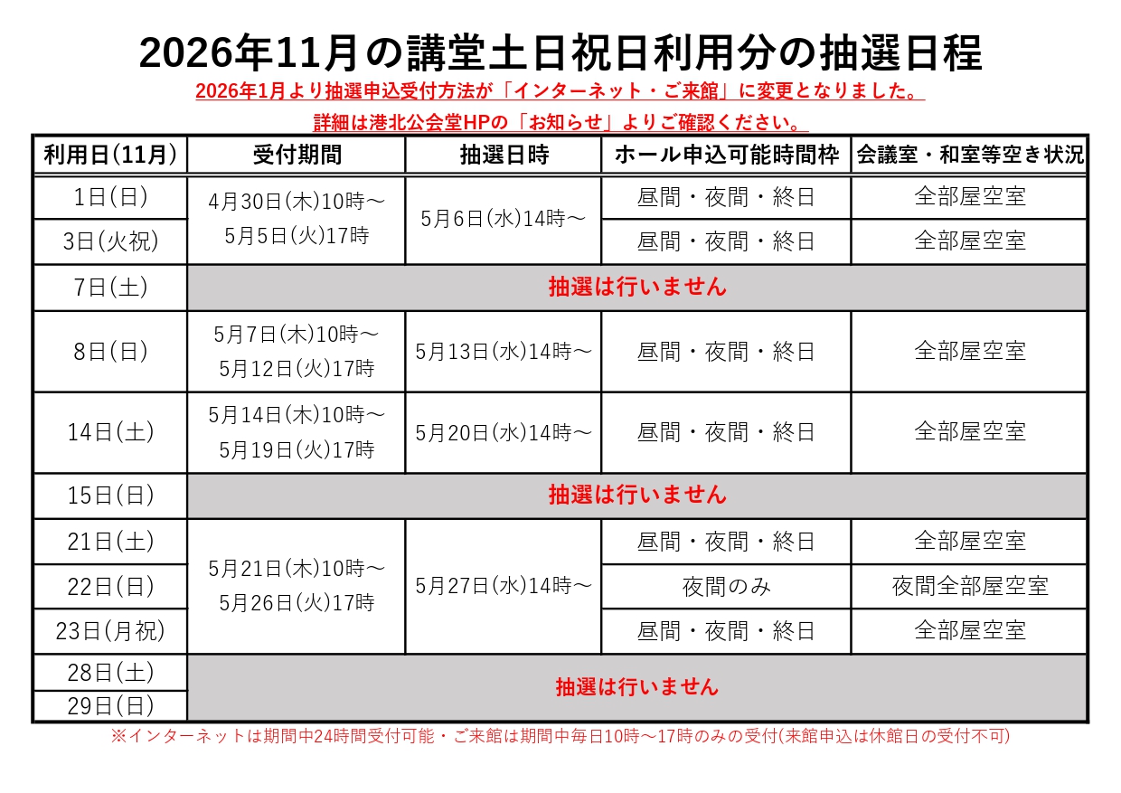 2026年11月の講堂の土日祝日利用分の抽選を、下記日程にて開催いたします。