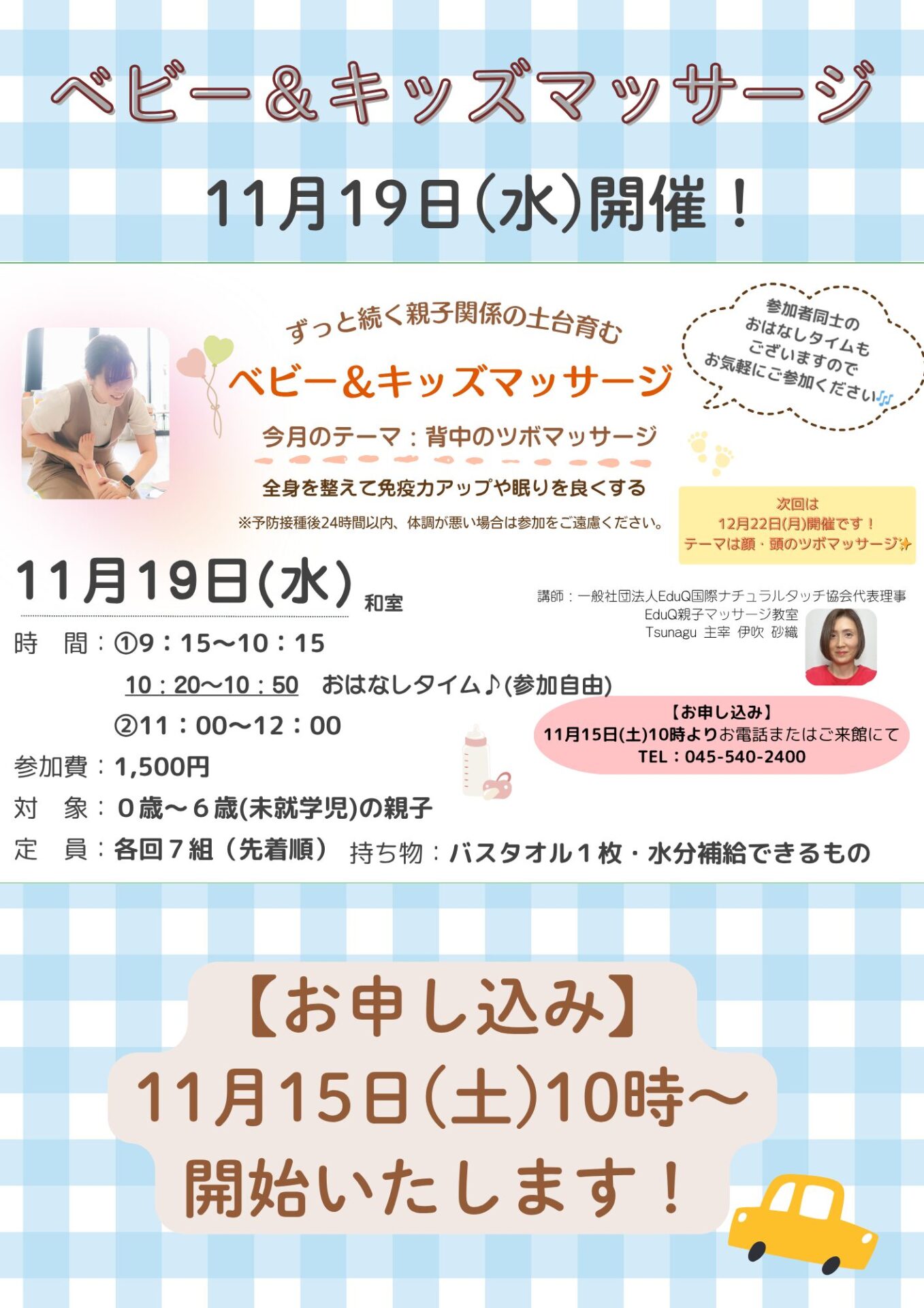 《11/15(土)10時~受付開始》11月19日(水) ベビー&キッズマッサージ