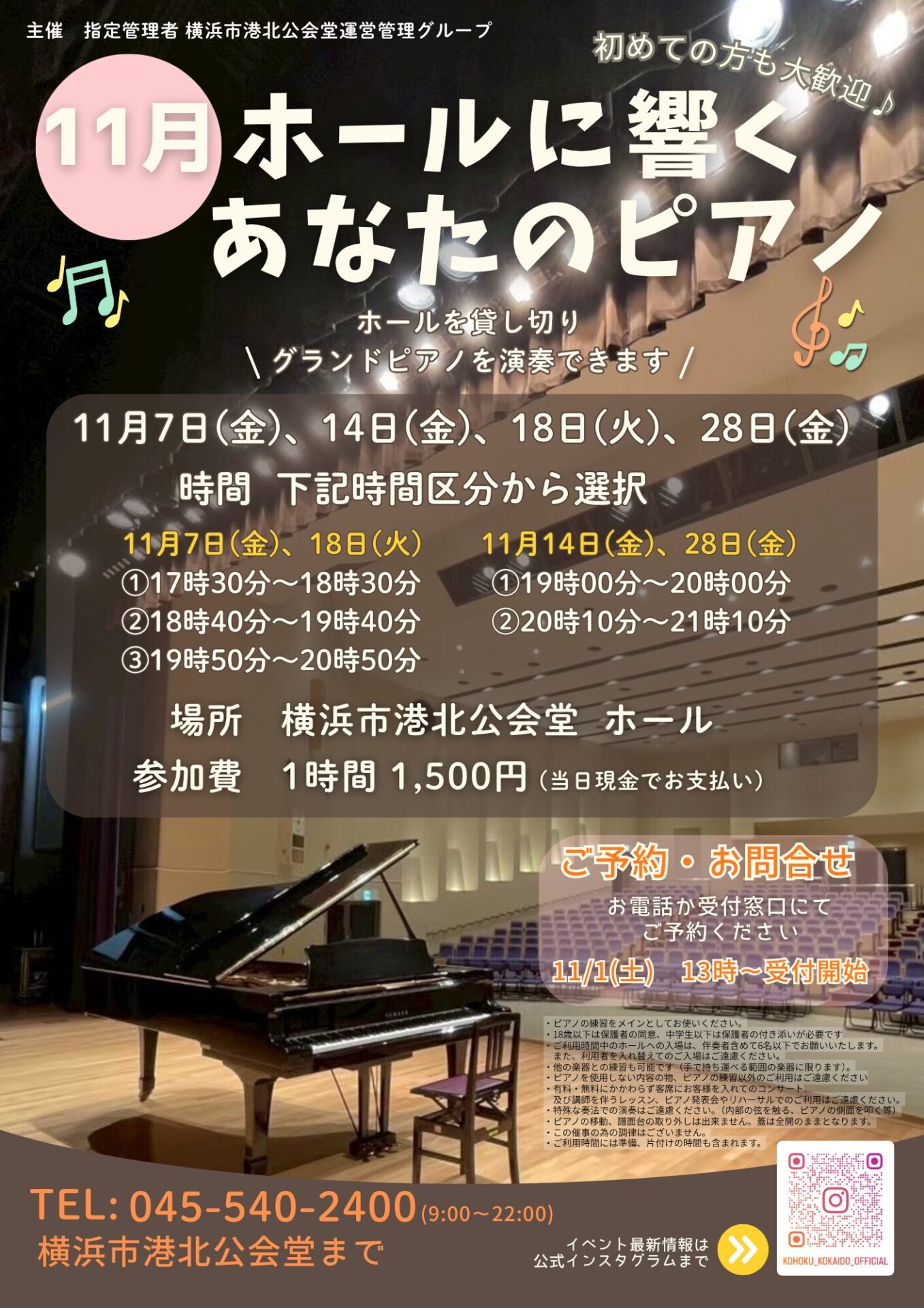 11月も、「リコーダー教室」と「ホールに響くあなたのピアノ」を開催いたします。